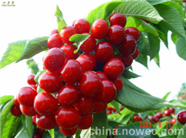 美早櫻桃苗由大連市農科院從美國引入,該品種果實個大而整齊,平均單果重9克左右,最大果重11.4克。果形寬心臟形,大小整齊,頂端稍平,果柄特別短粗。果面紫紅色,光亮透明。肉質脆而不軟,肥厚多汁,風味酸甜可口,品質優良,可食率達92.3%,可溶性固形物含量17.8%